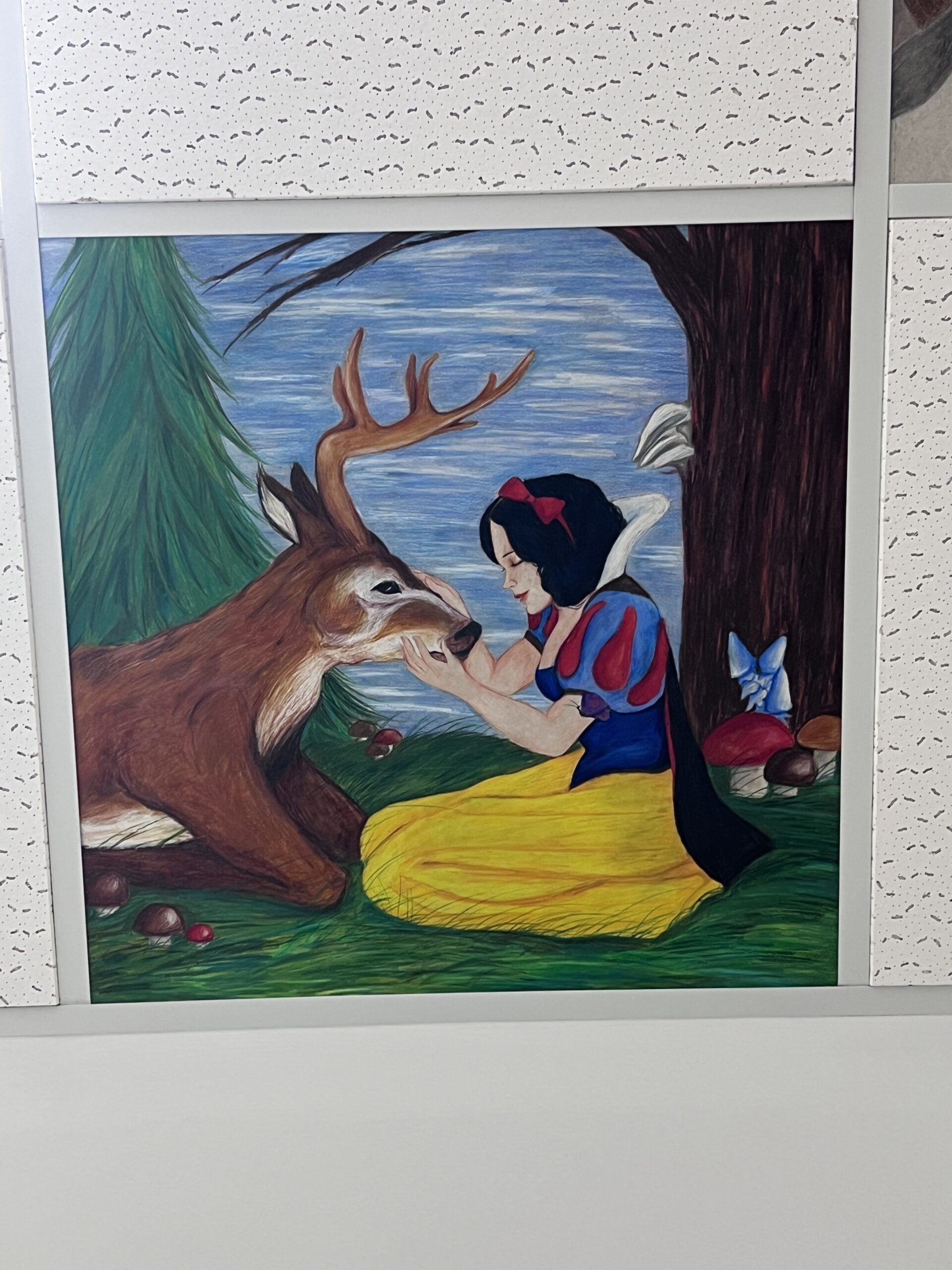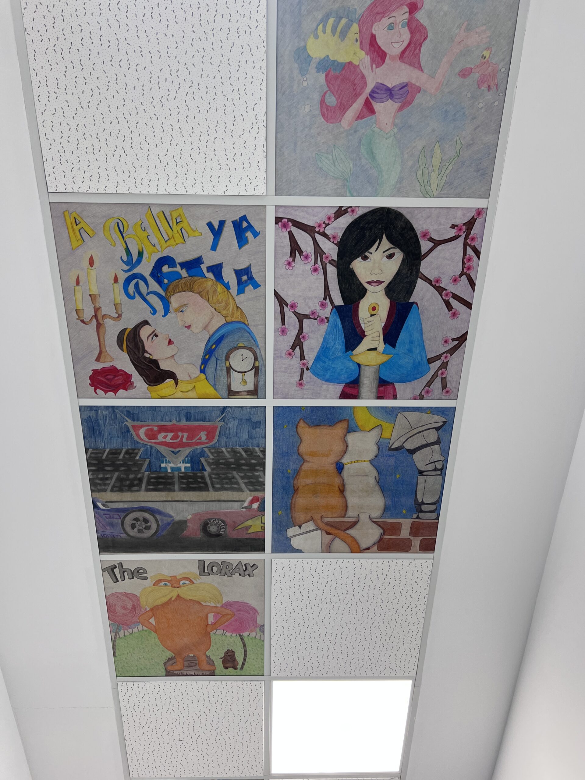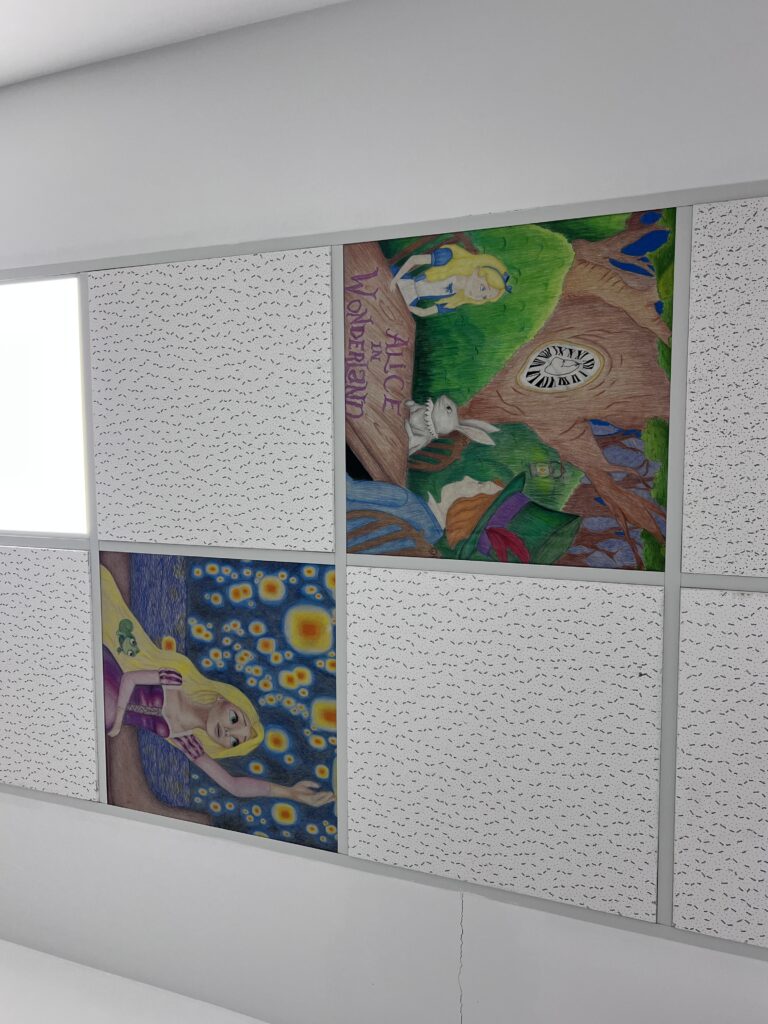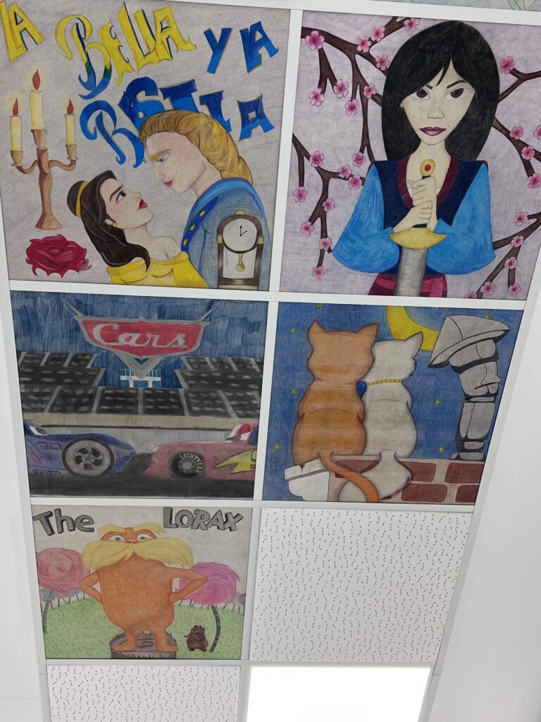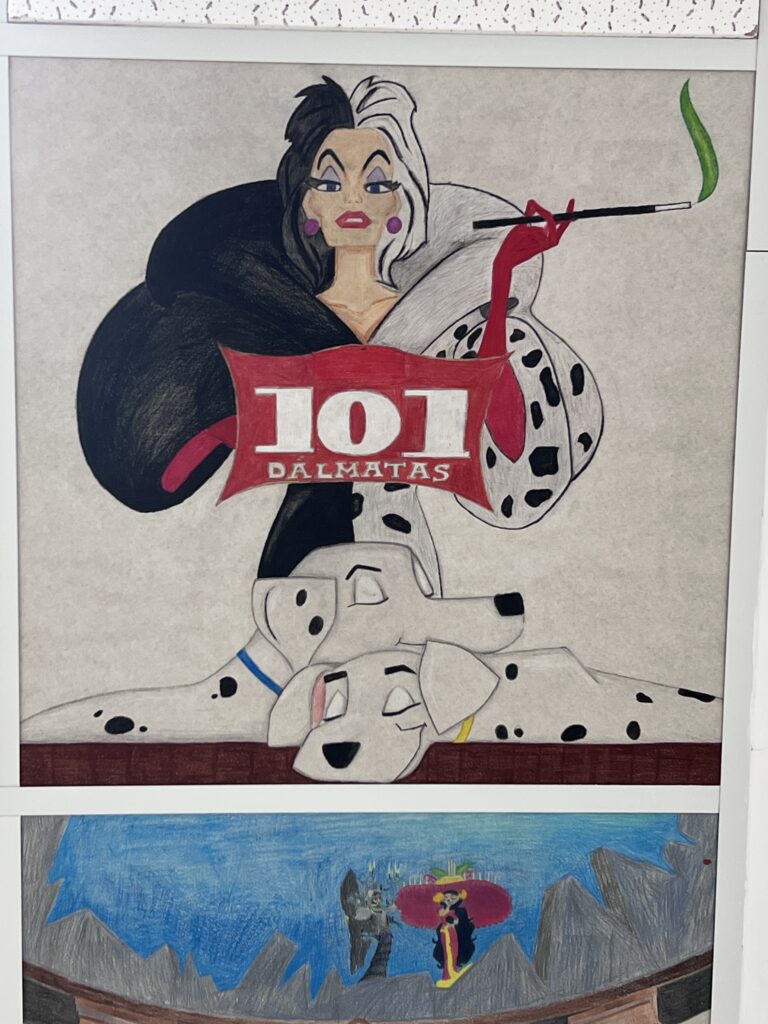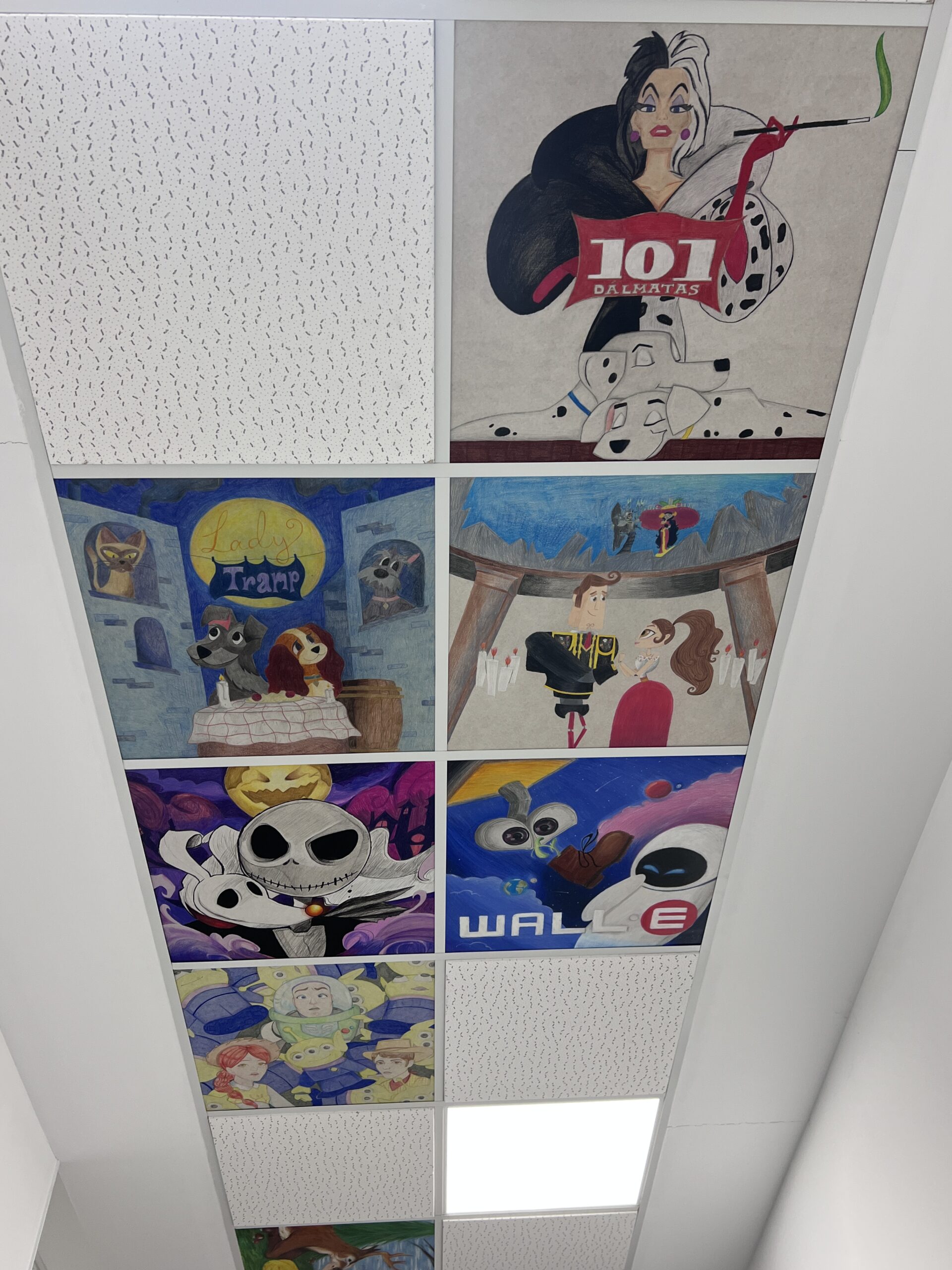 Este curso, la temática elegida ha sido el universo Disney, una propuesta que conecta con el imaginario colectivo y permite acercar al alumnado a referentes culturales reconocibles, reinterpretados desde una mirada artística y personal. Sobre paneles de pladur y utilizando lápices de colores con técnica seca, los estudiantes han dado vida a escenas, personajes y símbolos que ahora decoran pasillos y espacios comunes del colegio.