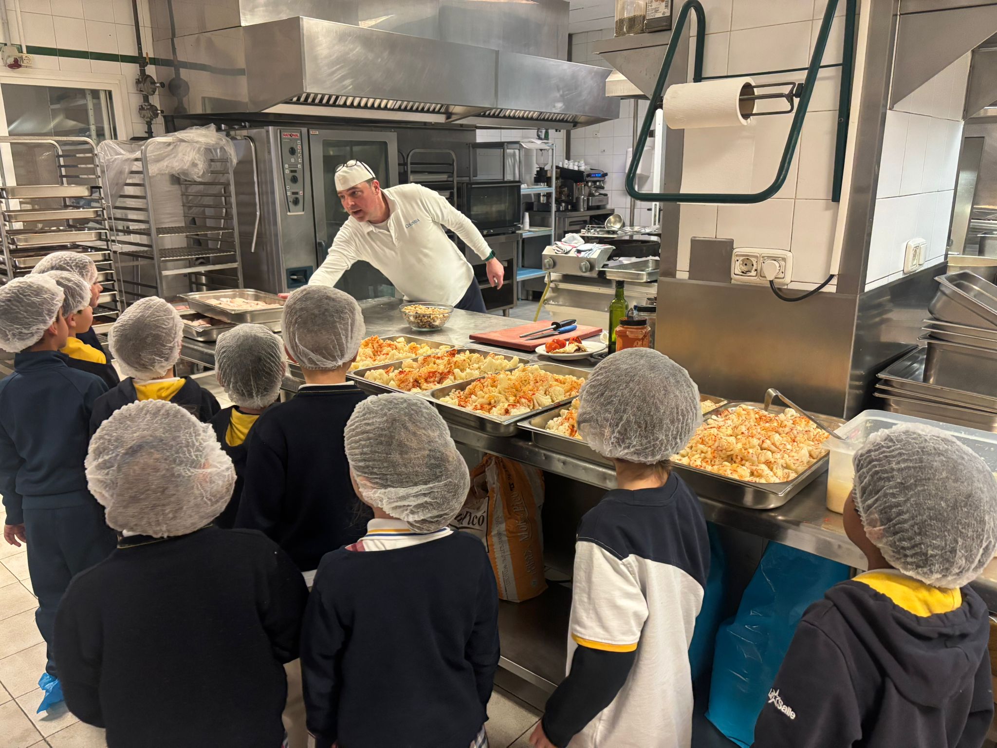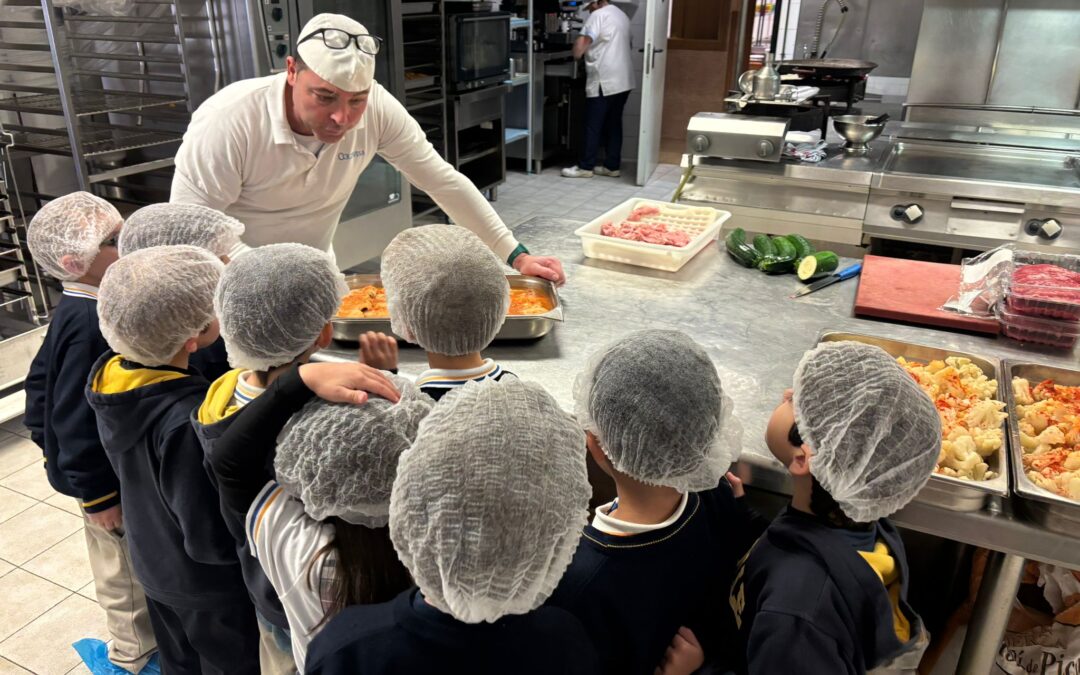 Durante la actividad, los alumnos y alumnas realizaron una visita guiada a la cocina del centro de la mano de Carlos, nuestro Jefe de Cocina, que cuenta con más de 30 años de experiencia y que cada día elabora la comida in situ en el colegio. Los niños y niñas pudieron conocer de primera mano los distintos espacios y utensilios de la cocina, como las neveras industriales, los hornos o las grandes ollas, despertando su curiosidad y entusiasmo por todo el proceso de elaboración de los menús escolares.