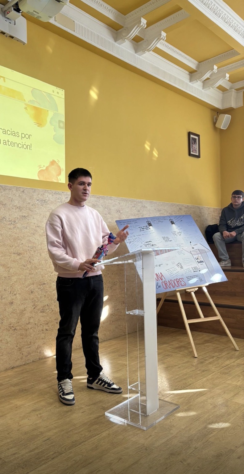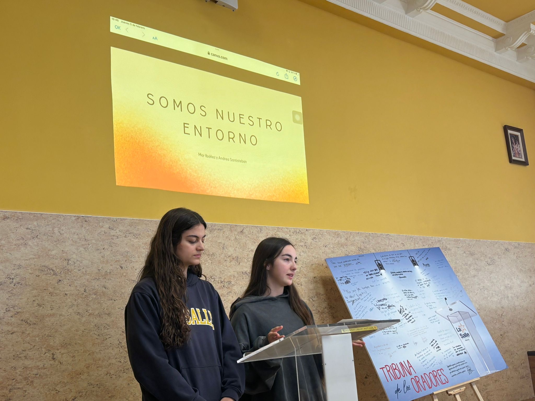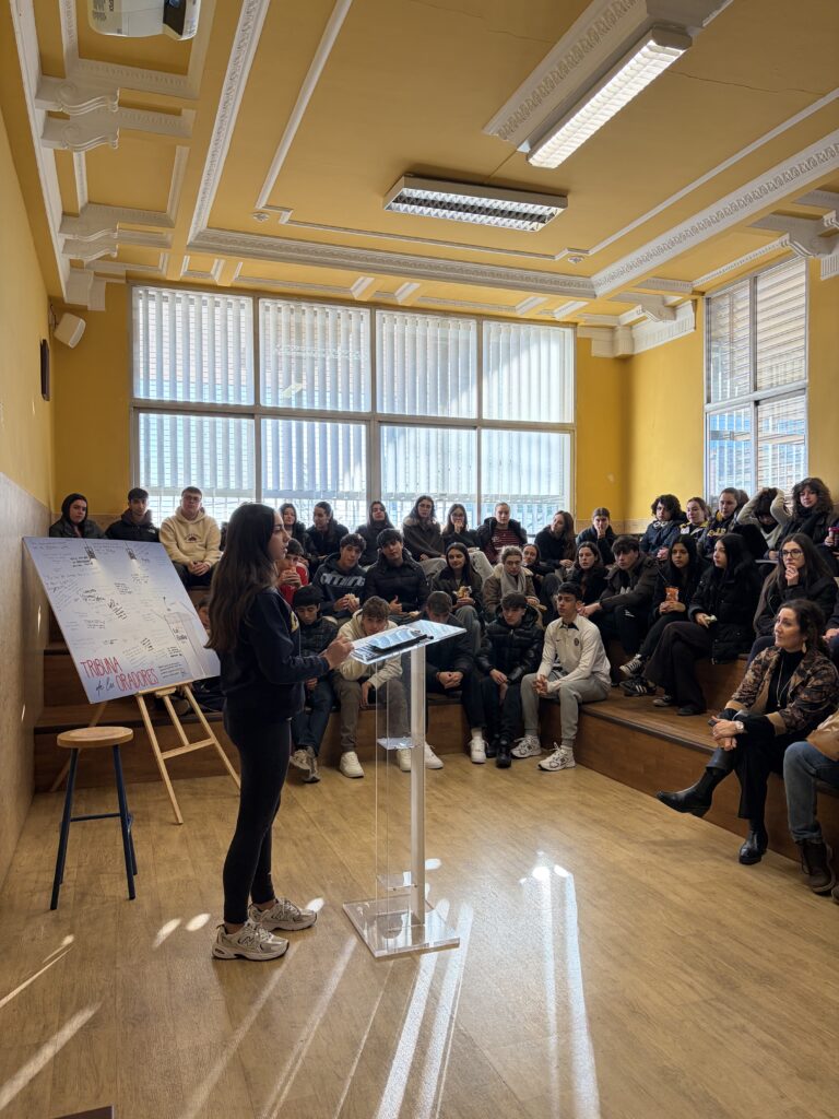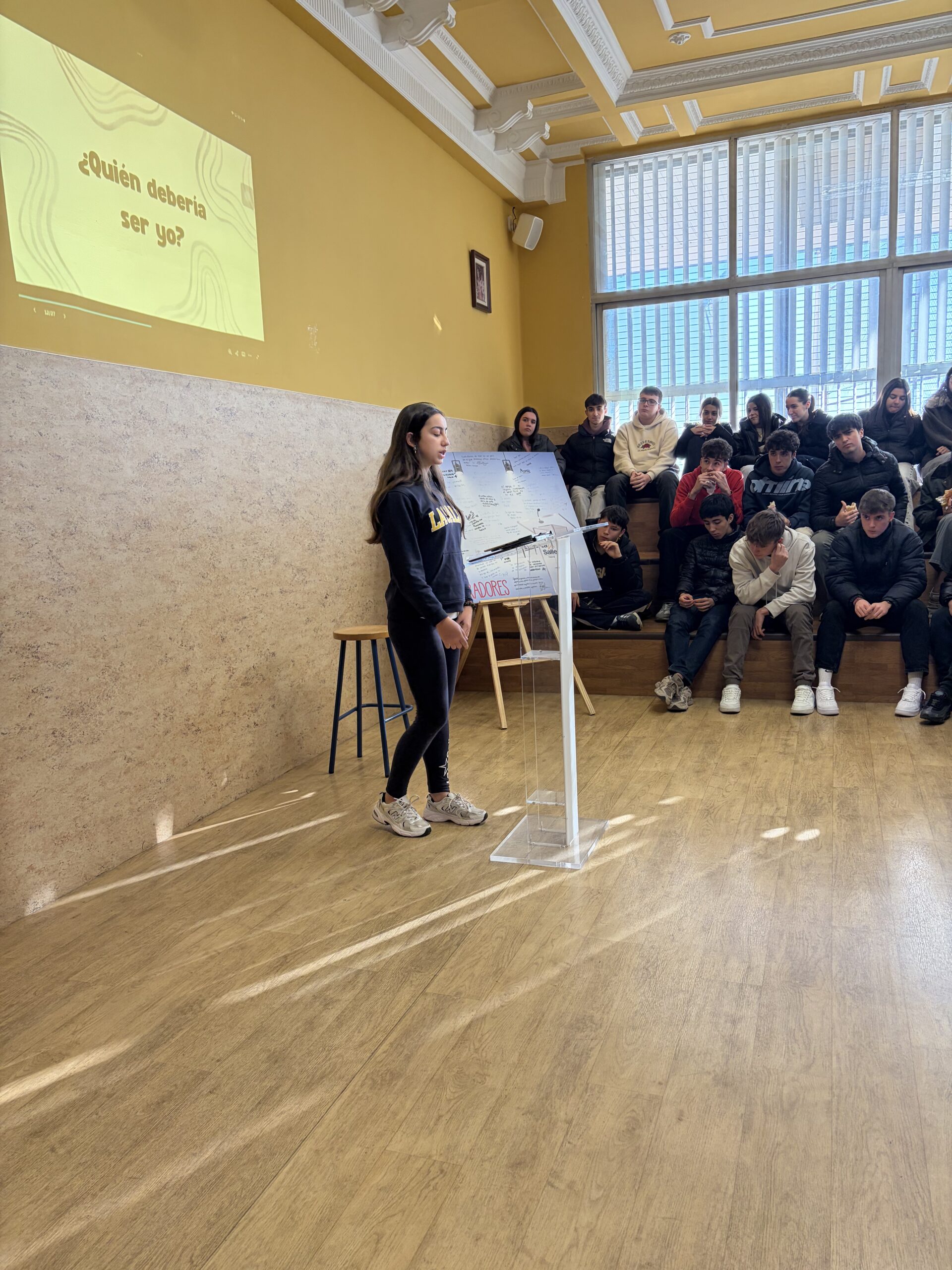 Mar y Andrea nos invitaron a imaginar otros escenarios de vida: ¿Y si hubiéramos nacido en otro país? ¿En otra familia? ¿Incluso en la clase de al lado? Partiendo de estas preguntas, reflexionaron sobre cómo el entorno —social, cultural y relacional— influye en nuestra identidad. Más allá de la genética o el lugar de origen, pusieron el foco en el factor psicológico y en cómo las decisiones que tomamos, condicionadas por nuestro contexto, moldean quiénes somos. Una oratoria que nos recordó que somos mucho más que lo que vemos en el espejo: somos historia, cultura, relaciones y experiencias compartidas.