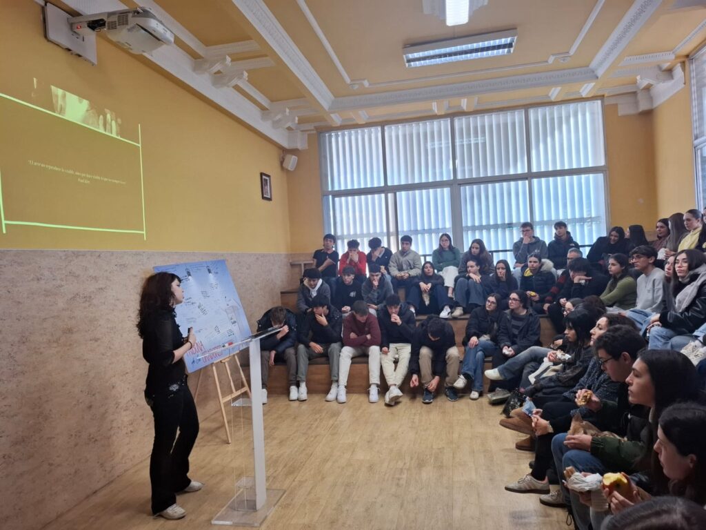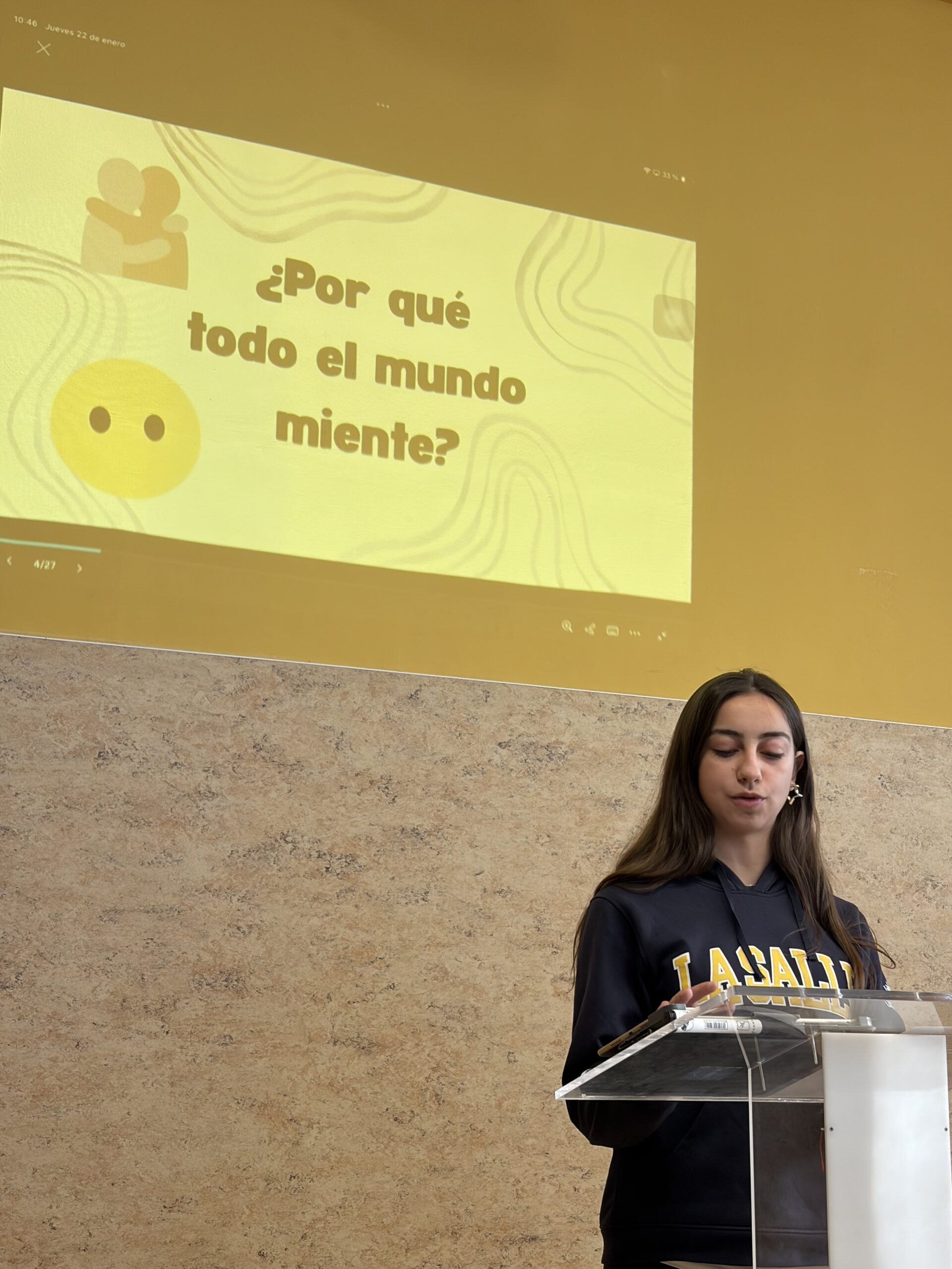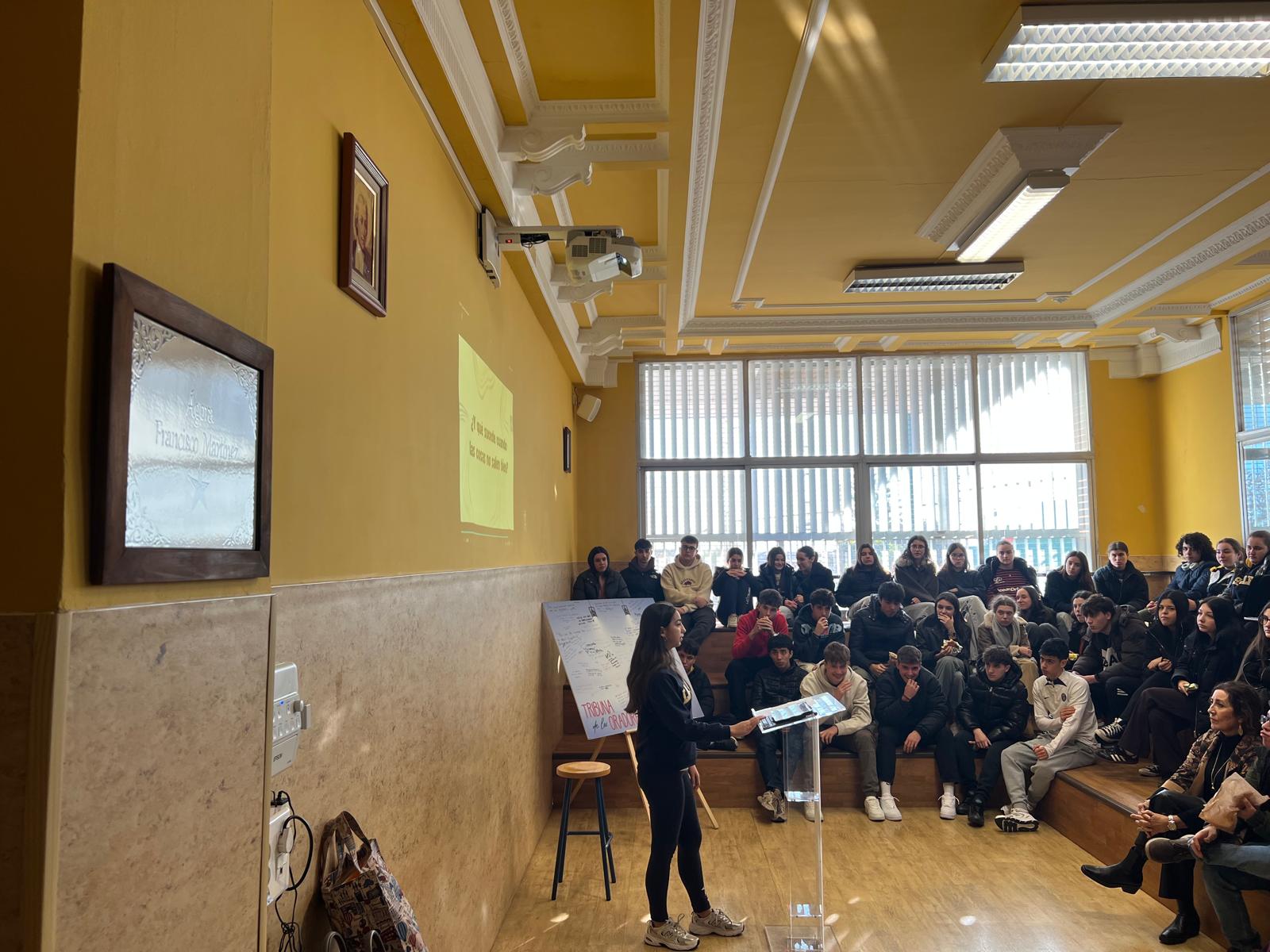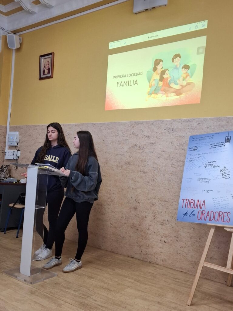 Mar y Andrea nos invitaron a imaginar otros escenarios de vida: ¿Y si hubiéramos nacido en otro país? ¿En otra familia? ¿Incluso en la clase de al lado? Partiendo de estas preguntas, reflexionaron sobre cómo el entorno —social, cultural y relacional— influye en nuestra identidad. Más allá de la genética o el lugar de origen, pusieron el foco en el factor psicológico y en cómo las decisiones que tomamos, condicionadas por nuestro contexto, moldean quiénes somos. Una oratoria que nos recordó que somos mucho más que lo que vemos en el espejo: somos historia, cultura, relaciones y experiencias compartidas.