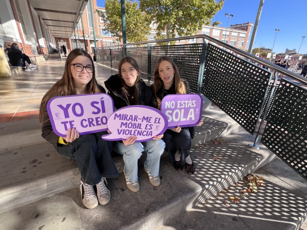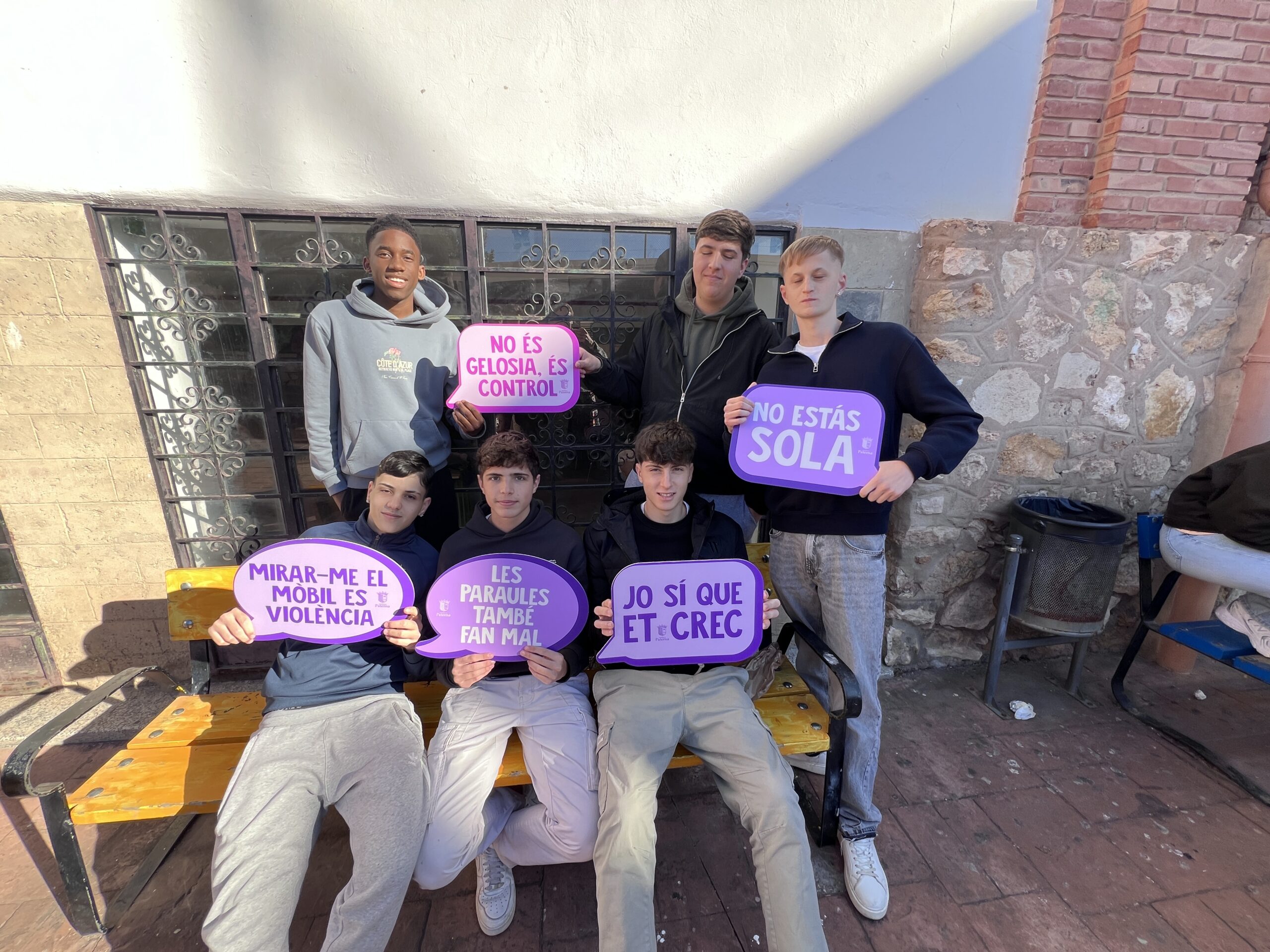 Durante la jornada, el alumnado ha trabajado con diferentes cartulinas en formato “bocadillo” —simulando mensajes o pensamientos— con frases en valenciano y castellano como “Las palabras también duelen”, “Mirar el móvil es violencia”, “Trenca el silenci” o “Rompe el silencio”. Estas dinámicas han permitido abrir un diálogo significativo con los y las estudiantes sobre la importancia del lenguaje, las relaciones sanas y los límites del respeto.